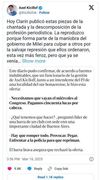 A través de su cuenta en X, Kicillof acusó al medio de ser parte de una «maniobra del gobierno de Milei» destinada a desviar la atención de la «brutal represión» que, según él, fue ordenada por el propio Ejecutivo. «Es una vergüenza, y es algo extremadamente grave», expresó.