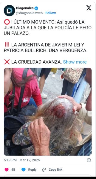 Las basuras de gobierno coimeros de Milei y Bullrich: Vídeo la Policía le abrió la cabeza de un palazo a una jubilada y la dejó inconsciente y está a punto de morir