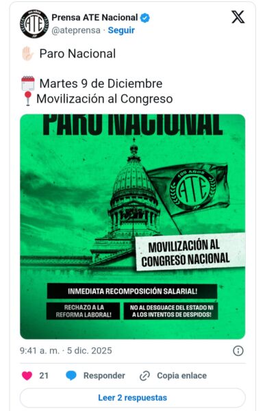 Los kukas aglutinados en la Asociación de Trabajadores del Estado (ATE) realizará este martes un paro nacional de 24 horas con movilización al Congreso desde las 11 de la mañana, en rechazo a la reforma laboral impulsada por el Gobierno de Javier “Jamoncito” Milei.