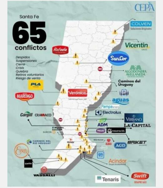 En territorio santafesino aparecen nombres emblemáticos como SanCor, Vicentín, Verónica, Vasalli, Tenaris, Acindar, Swift y Cargill, mientras que en la provincia de Buenos Aires predominan los conflictos en pequeñas y medianas empresas.