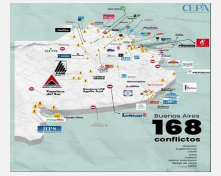 El CEPA también elaboró un mapa federal de conflictos, que releva 629 conflictos laborales y cierres de empresas entre 2024 y 2025 en todo el país. La provincia de Buenos Aires encabeza el ranking con 168 conflictos, seguida por Santa Fe, con 65, entre despidos, suspensiones, cierres, quiebras, retiros voluntarios y procesos de venta.