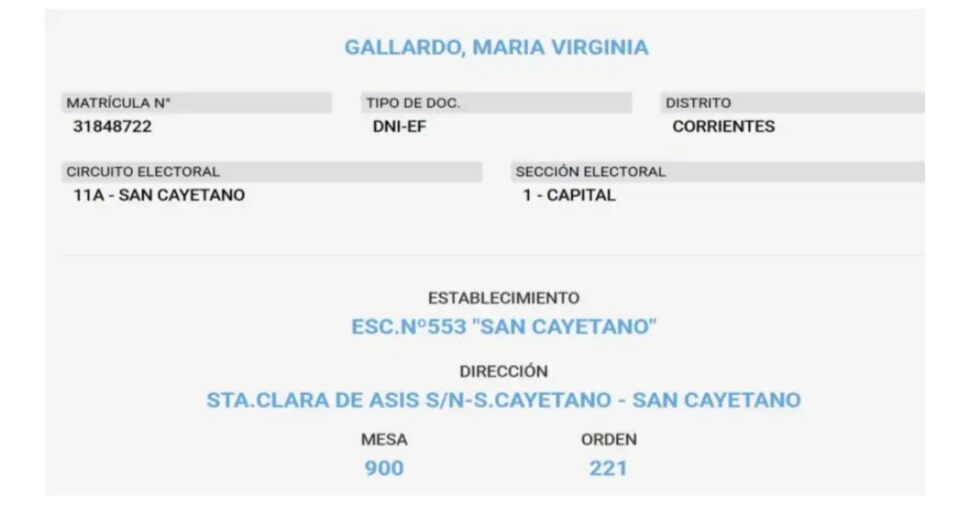 Según pudo saber este medio, Gallardo tiene domicilio en una localidad a veinte kilómetros de la capital provincial llamada San Cayetano, que, según el censo del año 2022, tiene 972 habitantes y pertenece al Departamento de Riachuelo.