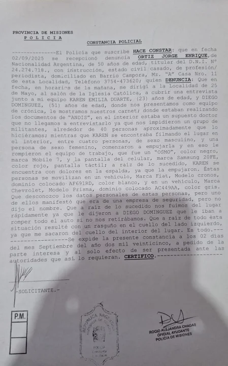 En medio del escándalo nacional por los audios del ex titular de la Agencia Nacional de Discapacidad (ANDIS), trascendió un grave episodio de violencia en Misiones. Una auditora del organismo, identificada como Laura Alicia Báez, fue demorada tras atacar y destruir los equipos de un móvil de Crónica TV que cubría un operativo en la localidad de 25 de Mayo.