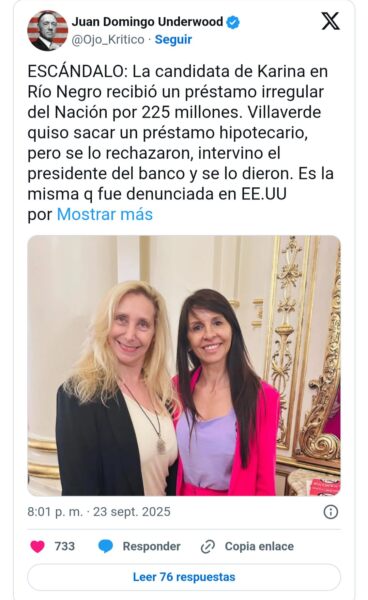 Karina Milei dice que lucha contra “la casta”, pero parece que la está reclutando. Su candidata a senadora en Río Negro, Lorena Villaverde, es el mejor ejemplo: en enero, el Banco Nación le negó un crédito hipotecario en Cipolletti porque no cumplía los requisitos.