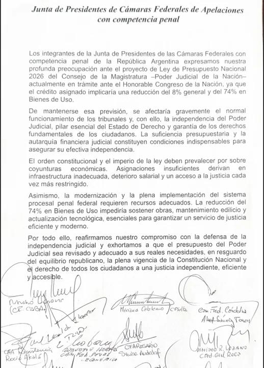 Los integrantes de la Junta de Presidentes de las Cámaras Federales con competencia penal de la República Argentina emitieron un comunicado donde hicieron foco en la preocupación que les genera lo previsto en la ley de Presupuesto Nacional 2026.