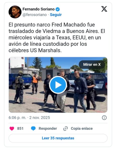 Federico «Fred» Machado, empresario argentino acusado de narcotráfico, lavado de dinero y estafas como parte de una organización delictiva transnacional, será extraditado a Estados Unidos este miércoles.