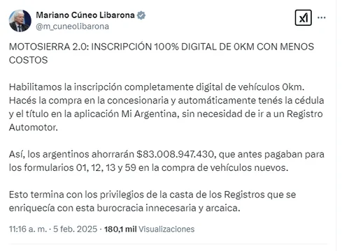 “Habilitamos la inscripción completamente digital de vehículos 0km”, anunció el ministro de Justicia, Mariano Cúneo Libarona.