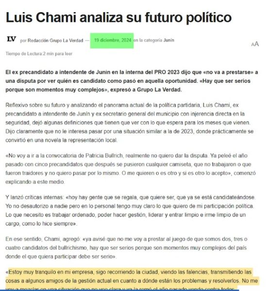 Ese mismo día, mientras sucedía todo esto, él dio una entrevista al portal “La Verdad Online” de Junín en donde dijo: “En lo personal tengo muy claro lo que quiero de mi participación política. Lo que necesito es trabajar ordenado, poder hacer gestión, liderar y entrar limpio e irme limpio de un cargo, como lo hice siempre“. Y agregó: “Estoy muy tranquilo en mi empresa, sigo recorriendo la ciudad, viendo las falencias, transmitiendo las cosas a algunos amigos de la gestión actual en cuanto a dónde están los problemas y resolverlos. He llegado a la conclusión, con mis casi 60 años, que la política es el arte de dividir y yo no quiero eso, estoy a unir y generar cosas para ayudar a mi ciudad“.