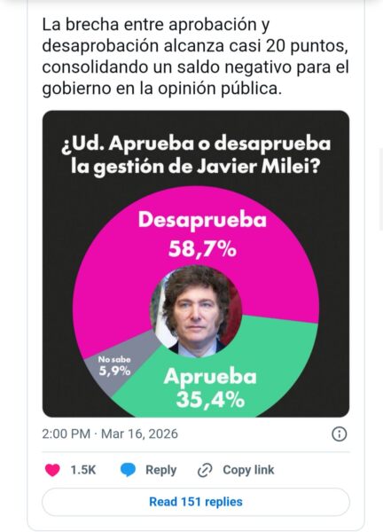 Asimismo, indicaron que “tras las elecciones legislativas del 2025, el gobierno registró un repunte en su evaluación pública y llegó a un escenario cercano al 50%-50%”, pero “en los últimos meses la desaprobación volvió a crecer y amplió la distancia en un contexto de crisis económica y nuevos casos de corrupción”.