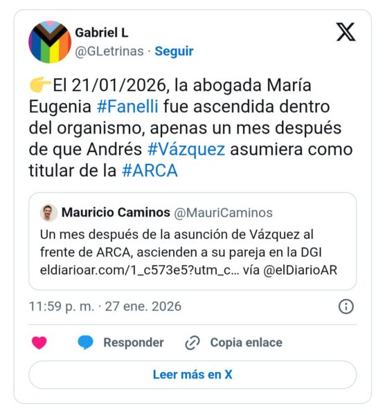 Fanelli fue promovida recientemente al cargo de subdirectora general de Operaciones Impositivas Metropolitana de la DGI, una de las áreas más sensibles del organismo recaudador. El ascenso, formalizado mediante la disposición 6/2026 publicada en el Boletín Oficial, se produjo apenas un mes después de que Vázquez asumiera la conducción de ARCA.