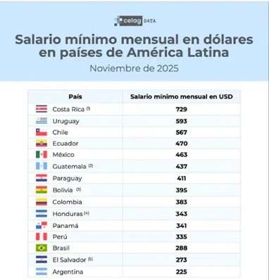 Encabeza el ranking Costa Rica, con 729 dólares. Argentina, con apenas 225 dólares, se encuentra por debajo de países con economías mucho más chicas como Bolivia y Paraguay. Entre 2023 y 2025, el SMVM cayó 34% en términos reales y hoy vale menos que antes del estallido de la convertibilidad.