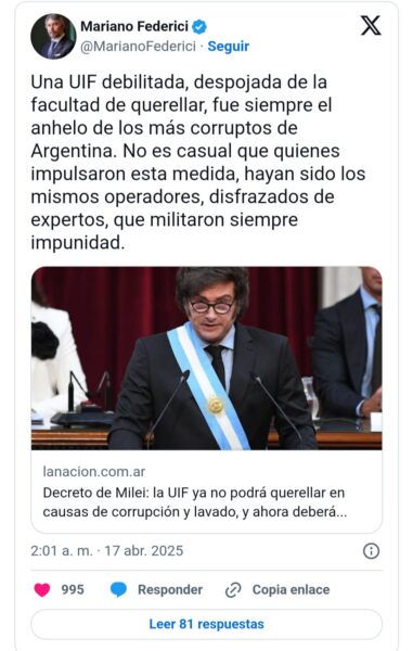 No obstante, para el ministro de Justicia, Mariano Cúneo Libarona, la decisión de eliminar la facultad de querellar UIF no es nada para preocuparse, sino que simplemente busca “fortalecer la institucionalidad del organismo” y “despolitizarlo”, como si la corrupción fuera problema ideológico y no hubiera chanchullos que salpican a todo el arco político, pasando desde la ex presidente Cristina Fernández de Kirchner, a su sucesor Mauricio Macri, el anterior mandario Alberto Fernández, y el actual jefe de Estado, Javier Milei.