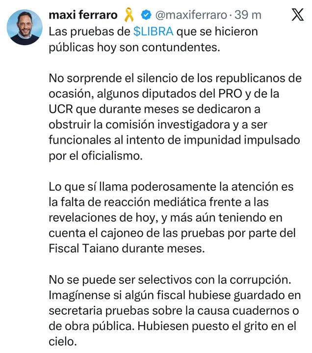 Entre las propuestas figura el lanzamiento de una “Moneda de Libertad”. “Con esta evidencia sobre la mesa, sumada al informe final de la comisión investigadora y a otras investigaciones, el fiscal y el juez ya no tienen excusas para mirar para otro lado”, sostuvo Ferraro en un posteo publicado en su cuenta de la red social X.