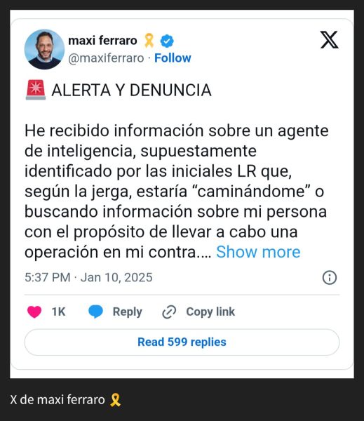«He recibido información sobre un agente de inteligencia, supuestamente identificado por las iniciales LR que, según la jerga, estaría “caminándome” o buscando información sobre mi persona con el propósito de llevar a cabo una operación en mi contra«, señaló el diputado a través de su cuenta de X.