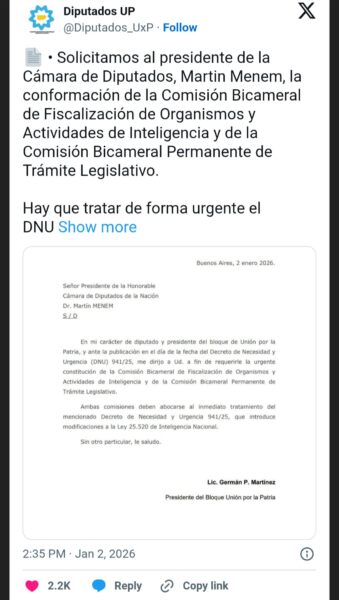 En ese marco, el peronismo ya puso manos a la obra y esta tarde envió una carta al titular de la Cámara de Diputados Martín Menem para solicitar la creación de la “Comisión Bicameral de Fiscalización de Organismos y Actividades de Inteligencia” y de la “Comisión Bicameral Permanente de Trámite Legislativo”. El objetivo de UP es darle tratamiento a través de esas dos áreas al susodicho DNU 941/25 y, más pronto que tarde, revocar el alcance de la medida desde el Poder Legislativo.