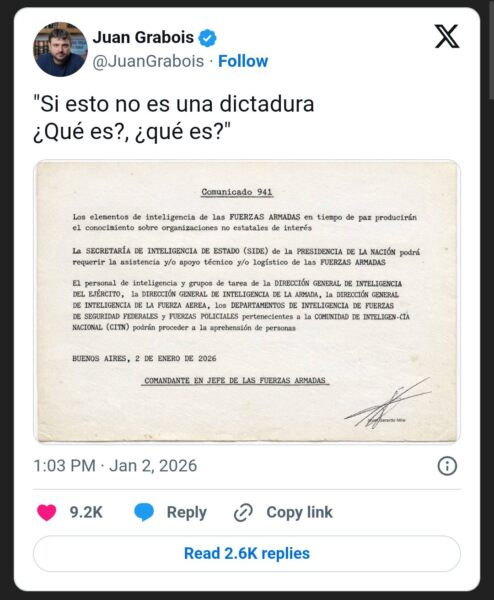 “Si esto no es una dictadura, ¿qué es?, ¿qué es?”: con esa frase de la canción Se viene de La Bersuit Vergarabat –esa que inicia con la icónica frase, muy utilizada en la política en los últimos años, de “Se viene el estallido”–, el diputado nacional Juan Grabois sintetizó la sensación que provocó en la oposición más lejana al Gobierno el súper DNU publicado hoy que le permite a la SIDE detener personas y establece como secretas todas las tareas del organismo, entre otros llamativos designios.