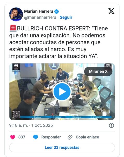 “Nosotros, que combatimos al narco con todo, no podemos aceptar conductas de personas aliadas al narco. Es muy importante aclarar la situación ya”, sostuvo Bullrich en declaraciones radiales.