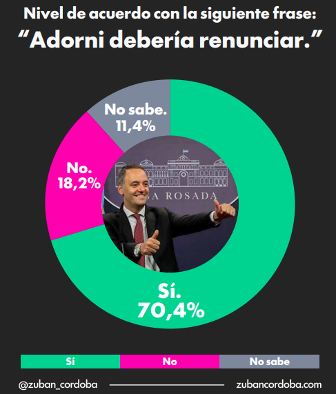 La consultora también indagó sobre la permanencia del funcionario en su cargo. Los resultados son contundentes: el 70,4% de los encuestados está de acuerdo con la afirmación de que “Adorni debería renunciar”. Solo un 18,2% se opone a esta idea, lo que deja al Ejecutivo en una posición de debilidad ante una demanda social mayoritaria que pide una purga en las filas oficiales.