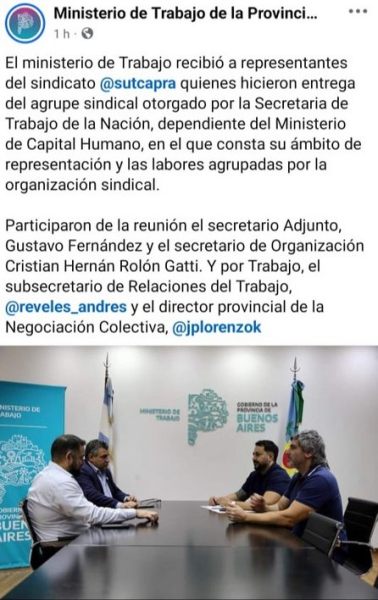 Juan Pablo Lorenzo y Andrés Reveles se reunieron con dirigentes de SUTCAPRA y avalaron la aplicación de su convenio en firmas del sector, a pesar que no cuenta con el aval legal para hacerlo. Además, se sumó un elemento político a la controversia, ya que el titular de ese sindicato, Leandro Nazarre, es candidato en las elecciones de UPSRA por la opositora Lista Verde, encabezada por Julio Gutiérrez, diputado libertario del Parlasur.