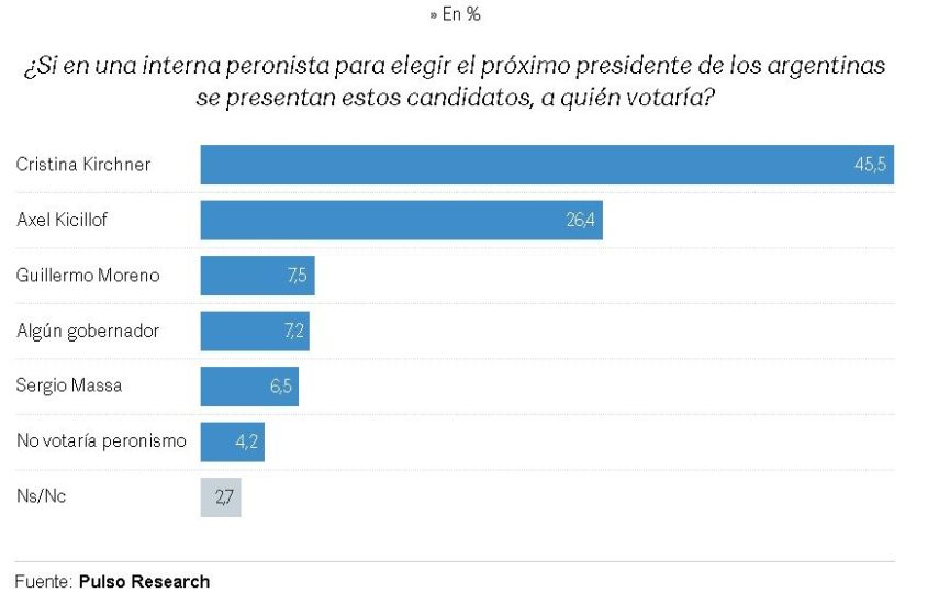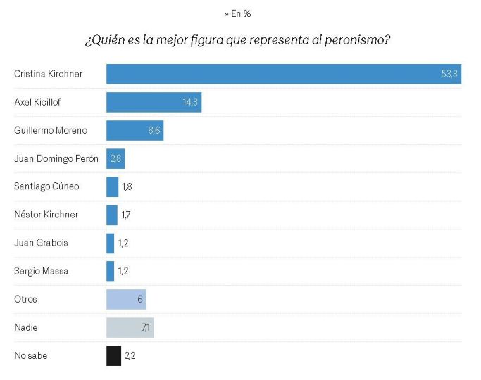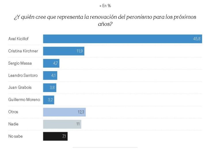 El estudio pregunta: «Aunque todavía falta mucho tiempo, si hoy se llevaran a cabo las elecciones para elegir al próximo presidente de todos los argentinos y en la interna peronista se presentan los siguientes candidatos, ¿a quién votaría?». Los resultados son los siguientes: