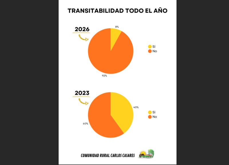 En términos generales, el 76% de los caminos rurales fue calificado en estado “malo”, lo que representa un deterioro significativo frente al 53,4% relevado en 2023. La situación también se refleja en los niveles de transitabilidad: solo el 8% de los caminos puede utilizarse durante todo el año, mientras que el 92% restante presenta períodos en los que resulta intransitable.